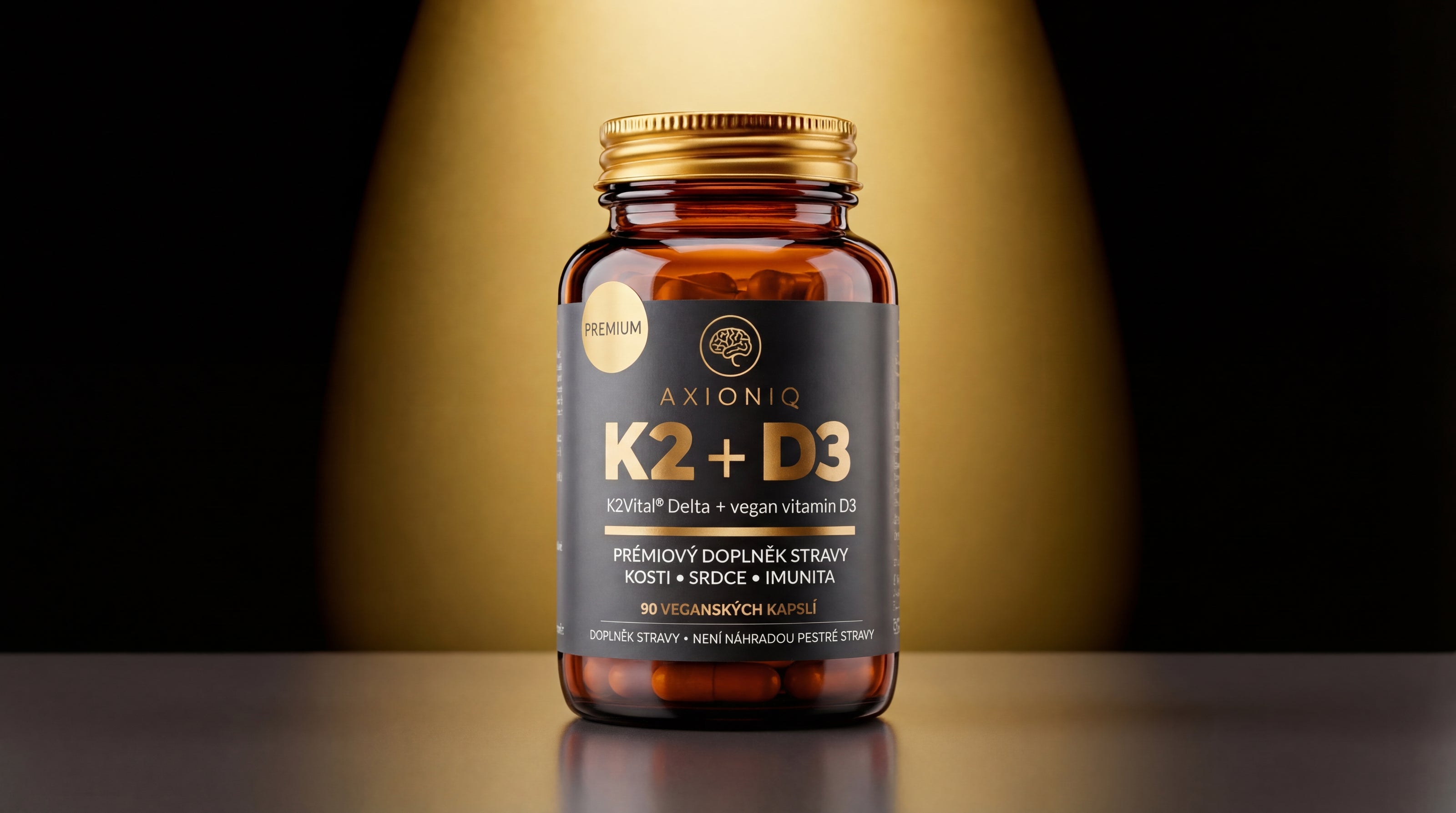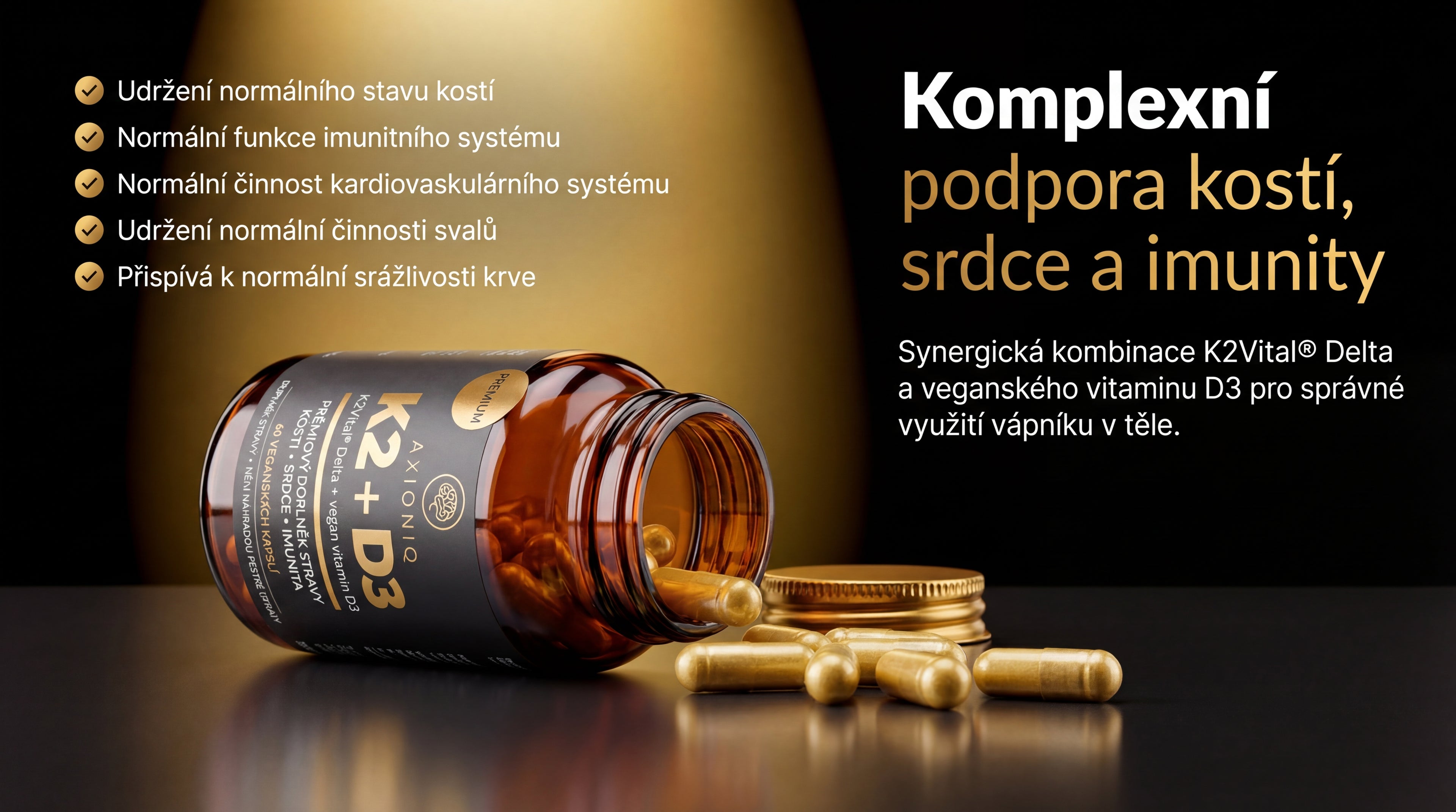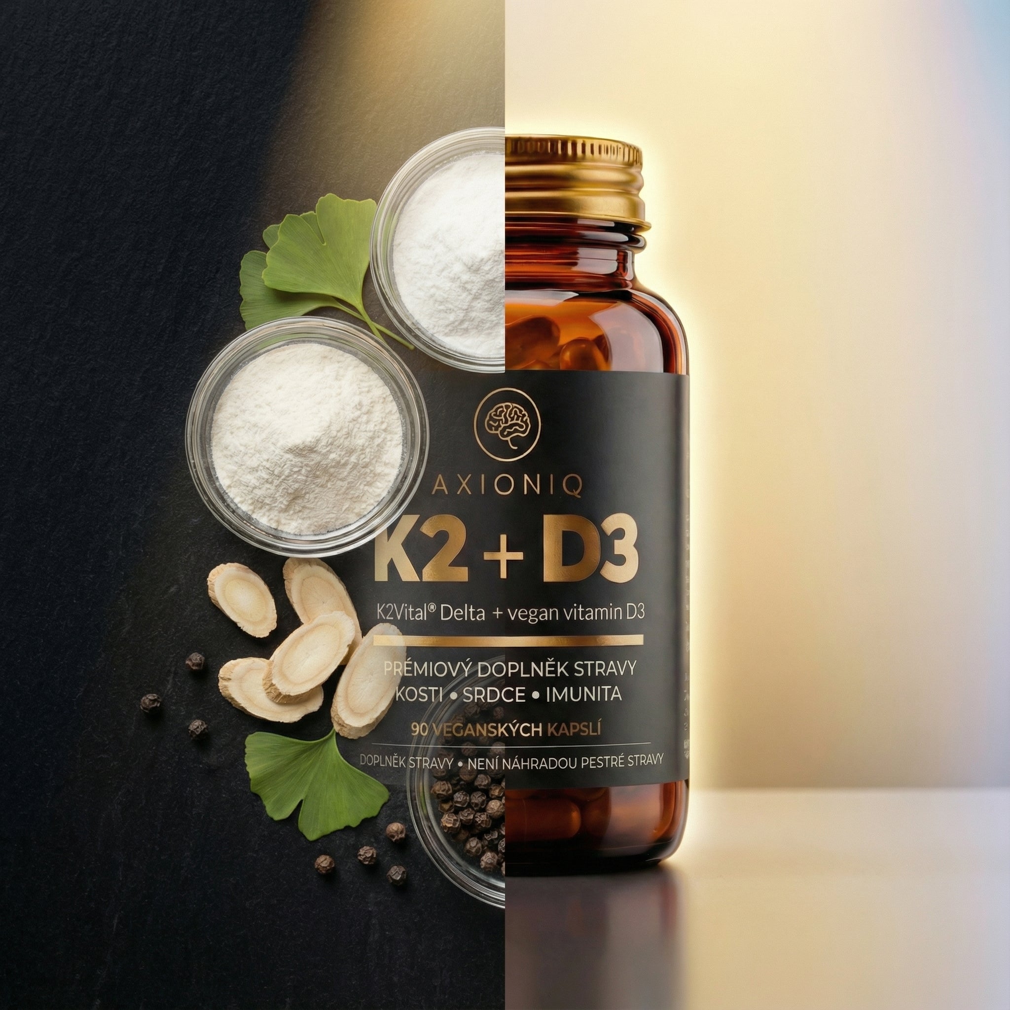 Axioniq K2 + D3 + B6 (P5P) je strategická kombinace tří látek pro maximální synergii. Vitamin D3 (2000 IU) je základem imunity. Aby však fungoval bezpečně, doplňuje ho Vitamin K2 ve formě MK-7. Jde o biologicky nejcennější formu, která v těle vydrží nejdéle a efektivně naviguje vápník přímo do kostí, nikoliv do cév.
